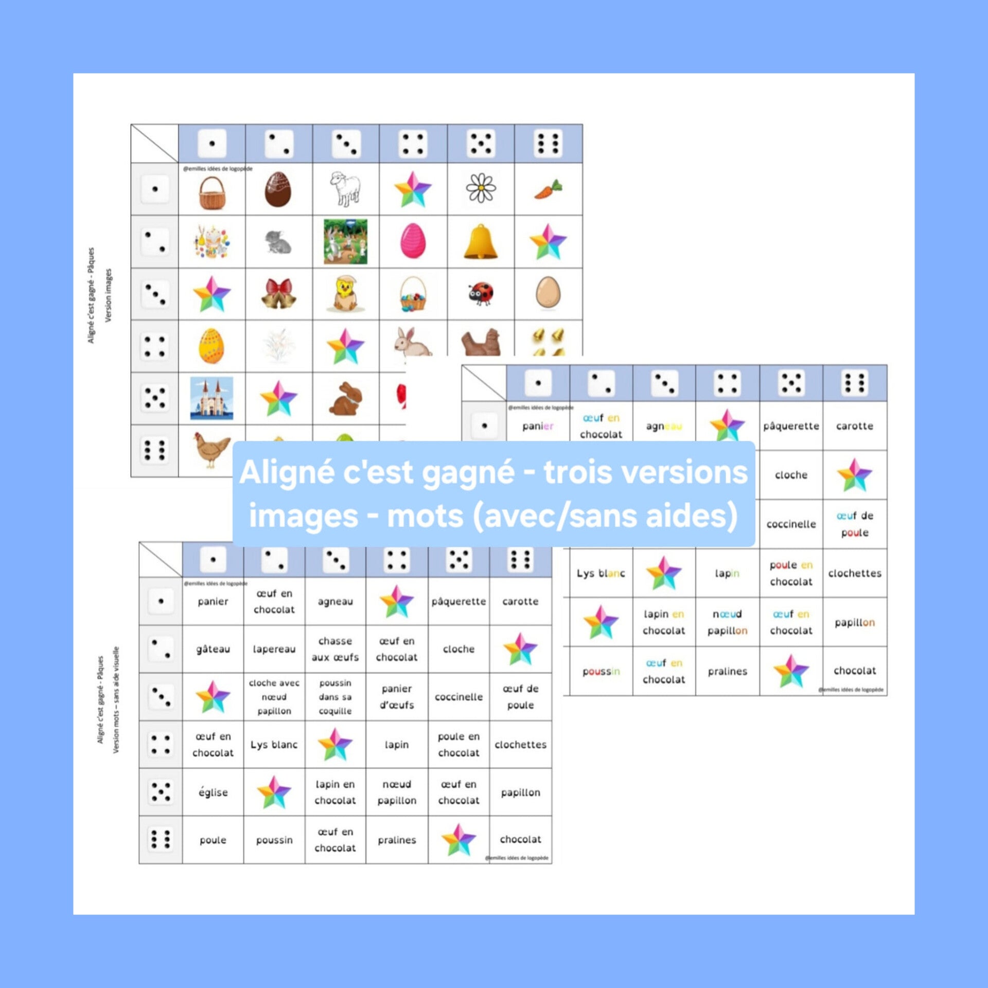 - Aligné c'est gagné -> trois versions (images/mots avec et sans aide visuelle)